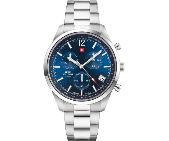 با توجه به رویکرد ساعت‌سازی سوئیسی ما، قاب و بند این ساعت نقره‌ای کرونوگراف از جنس استیل ضد زنگ بادوام ساخته شده است. یک شیشه معدنی K1 سخت‌کاری شده اضافی با روکش یاقوت کبود، صفحه آبی ساعت را پوشانده است. تمام نشانگرهای ساعت، و همچنین عقربه‌های ساعت‌شمار و دقیقه‌شمار، درخشان هستند و در تاریکی می‌درخشند. این کرونوگراف مردانه با موتور کرونوگراف سوئیسی کار می‌کند.